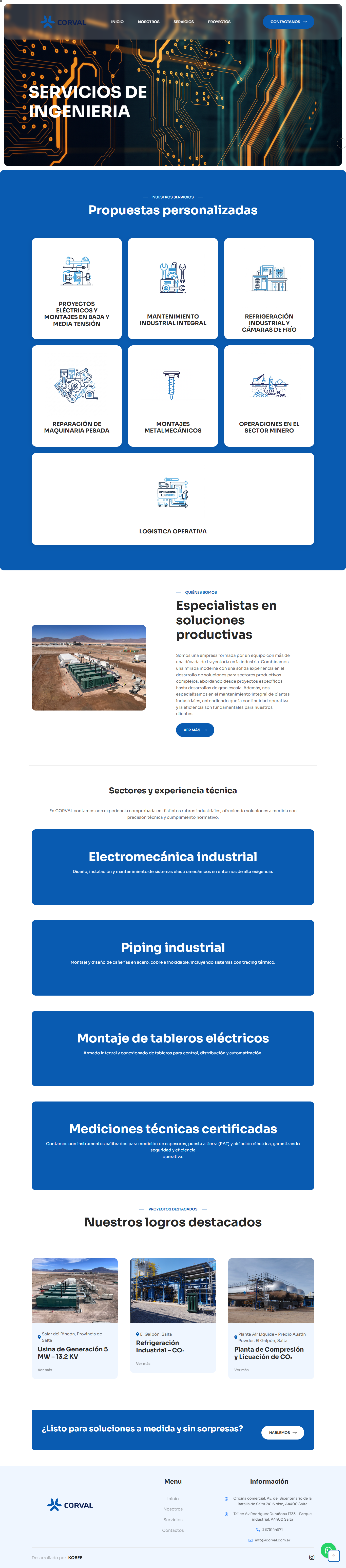 Requerimientos del proyectoCorval necesitaba un sitio web corporativo que reflejara su experiencia técnica, su enfoque industrial y su solidez en el mercado de servicios de ingeniería (proyectos eléctricos y montajes, mantenimiento industrial integral, refrigeración industrial, etc.).