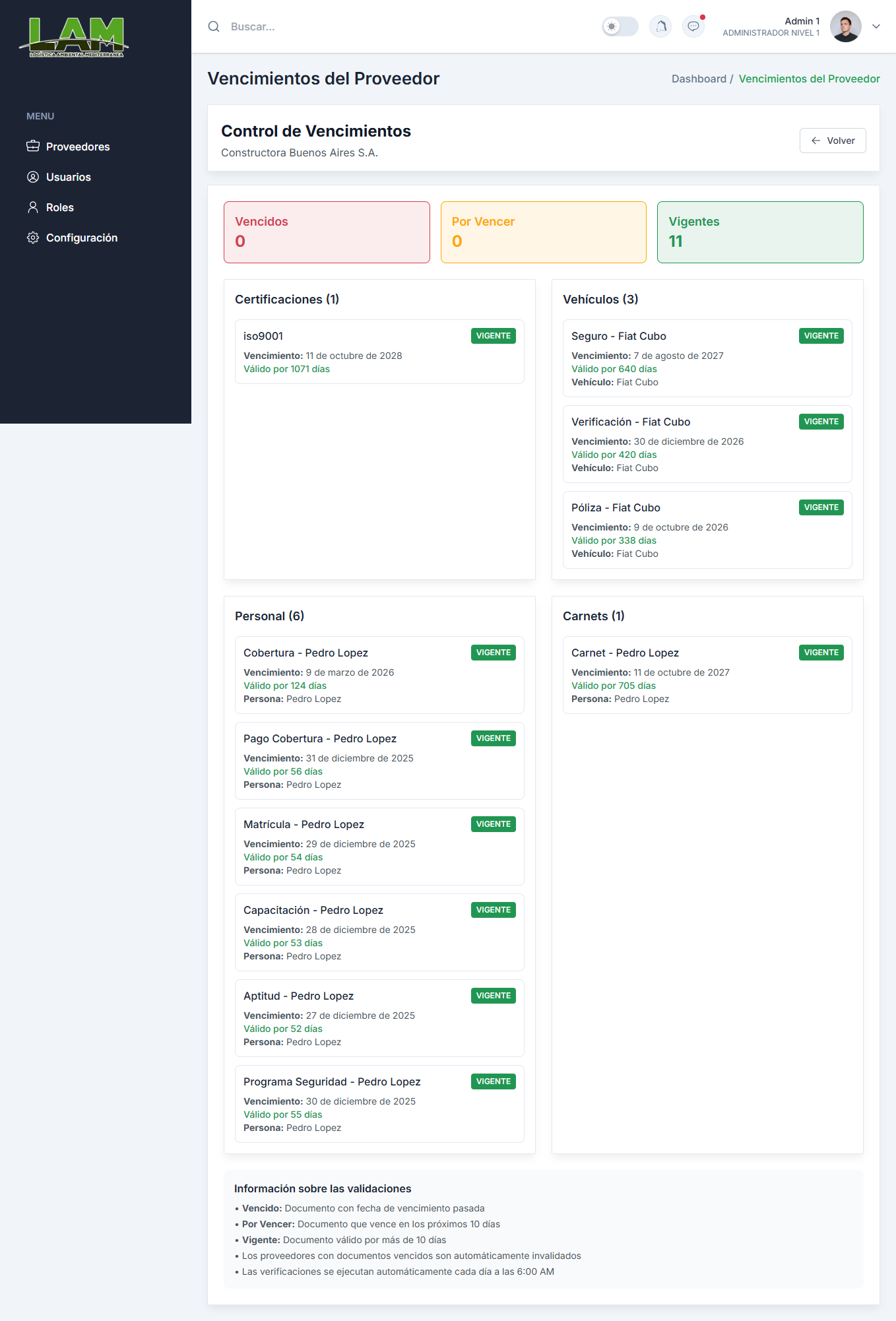 Se desarrolló para LAM S.A. una aplicación web moderna, segura y responsive que centraliza y automatiza la gestión integral de proveedores y el control de accesos. La plataforma incluye módulos para la carga, validación de documentación y gestión de usuarios, destacando una interfaz especial para la Garita que permite al personal de seguridad verificar y autorizar ingresos en tiempo real de forma visual y rápida. Al centralizar todos los datos en una única base, el sistema garantiza la trazabilidad completa de operaciones, consistencia informativa y seguridad operativa mediante autenticación por roles, resultando en una herramienta robusta que mejora la eficiencia administrativa y la seguridad de la planta.